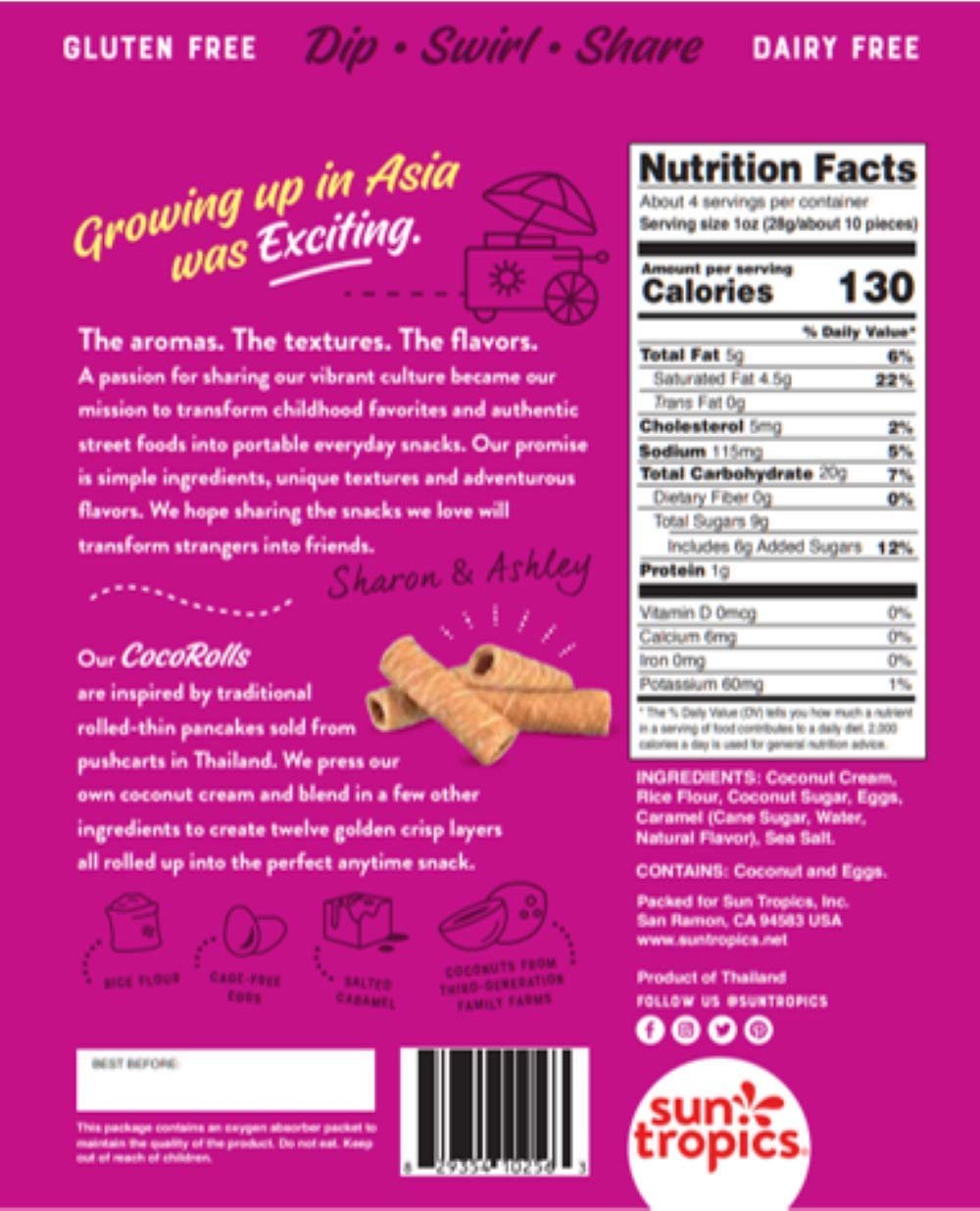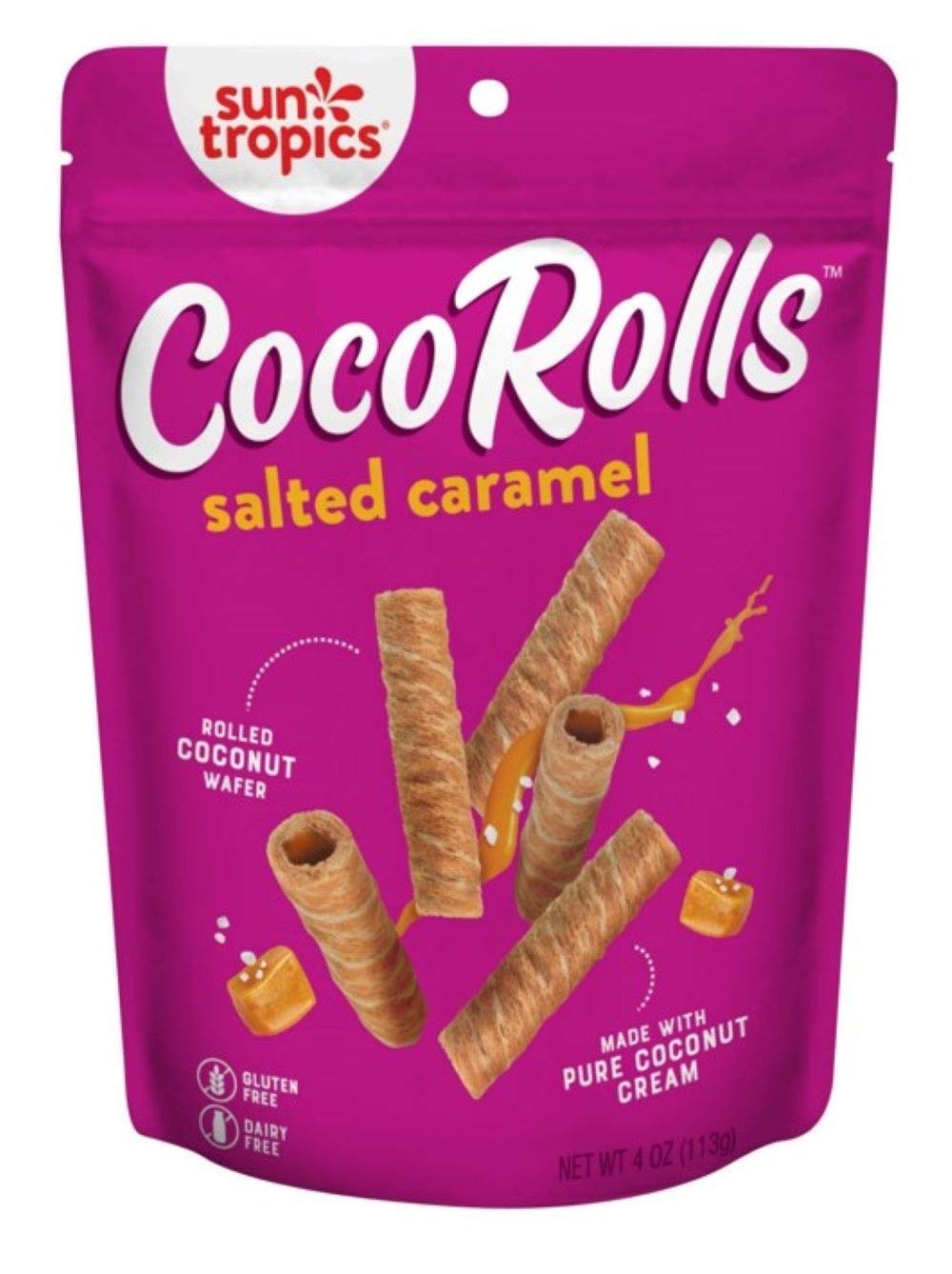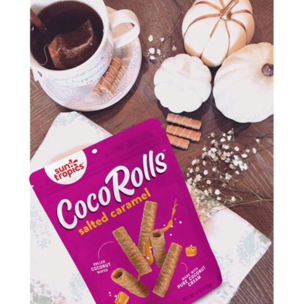 Sun tropics coco rolls salted caramel, rolled coconut wafer are baked to perfection. This product is made with coconut sugar and coconut milk while remaining gluten-free and delicious. Sun tropics coco rolls salted caramel, rolled coconut wafer comes packaged for your convenience in a bag containing 4 ounce of product.
