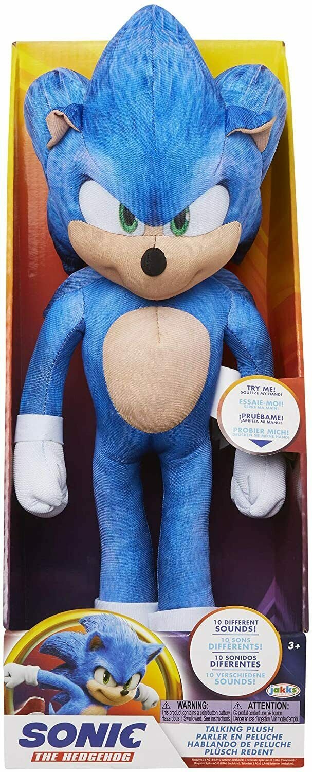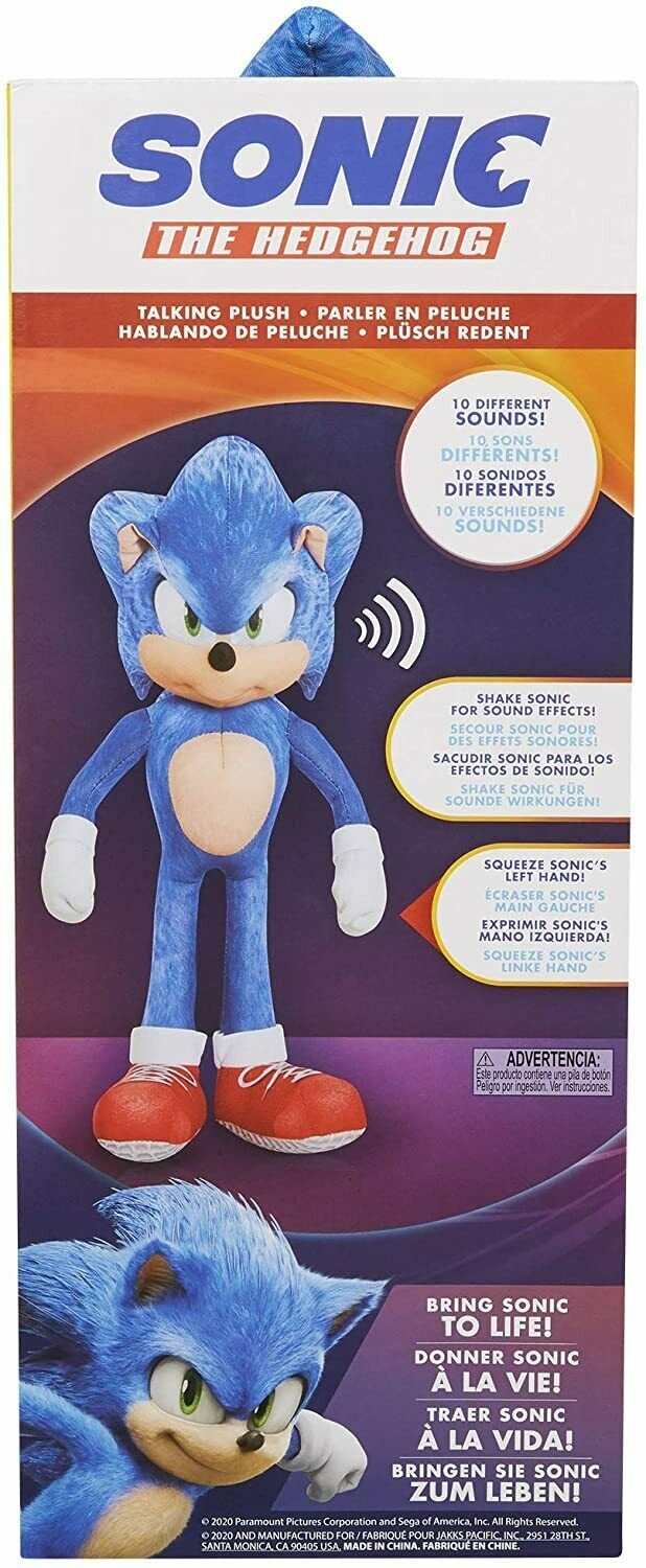 Bring Sonic to life with this 13 inch tall talking plush! Featuring seven phrases from the movie and three sound effects, Sonic includes a total of 10 different sounds. Squeeze Sonic's left hand to cycle through each of his seven phrases. Shake Sonic to trigger the three unique sound effects. With detailed movie styling and a variety of sounds, this talking plush brings Sonic's awesome personality to life!