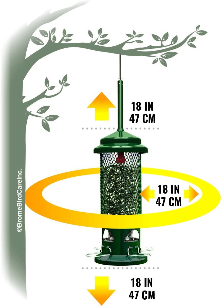 Be sure to allow for at least 16 inches (40 cm) of clearance around the feeder. This clearance will prevent a squirrel from reaching over from a nearby foothold to access the seed without placing its weight on the feeder. Forcing the squirrel to climb all the way onto the feeder triggers the closing mechanism, preventing access.