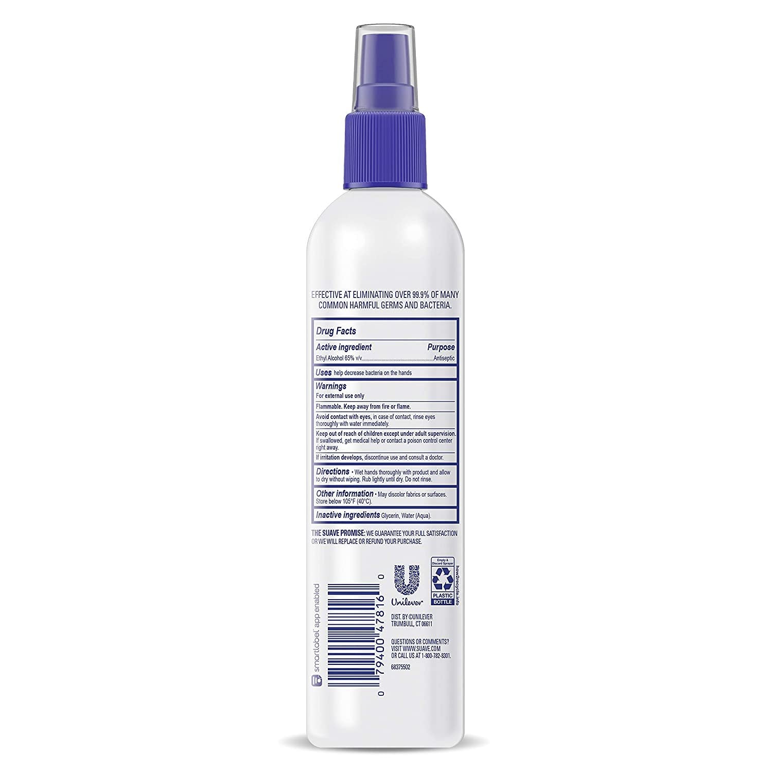 Illness causing germs are all around us- at home, at work, and when you’re out and about. Suave Hand Sanitizer kills 99.9 percent of germs. Alcohol-based hand sanitizer helps eliminate over 99.9 percent of many common harmful germs and bacteria. This hand sanitizer formula can be used on hands when soap and water are not available. Travel hand sanitizer in a convenient 10 oz spray bottle fits easily on countertops or desks. To use, wet hands thoroughly with product and allow to dry without wiping. Rub lightly until dry. Do not rinse.